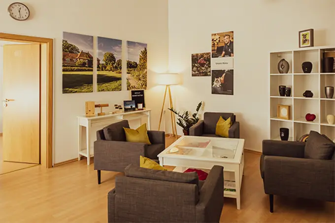 Tierhalter, die eine letzte Ruhestätte für ihre Haustiere suchen und würdig Abschied nehmen möchten, können sich vertrauensvoll an das Team vor Ort wenden. Dort werden sie nicht nur bei allen Fragen rund um die Themen Feuerbestattung und Beisetzung beraten, sondern werden auch feinfühlig in ihrer Trauer unterstützt und begleitet. In den stilvollen Räumlichkeiten der Niederlassung lassen sich offene Fragen im persönlichen Gespräch mit den Mitarbeitern in Ruhe gemeinsam klären.